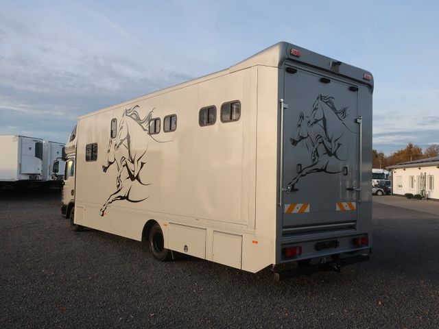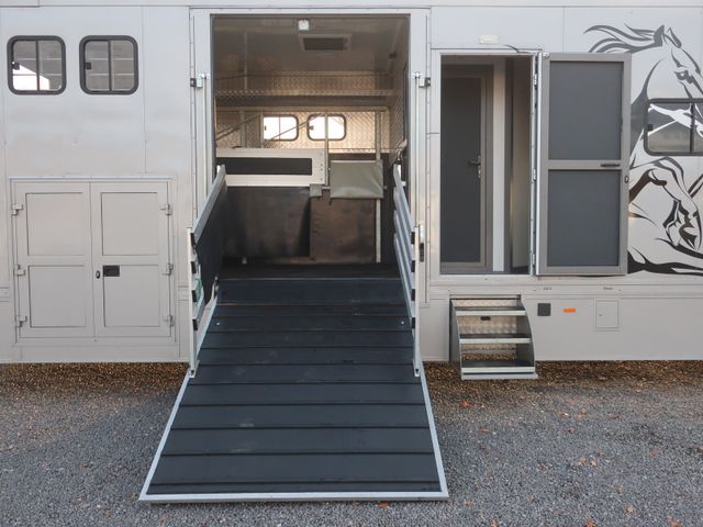 Laderaum: 5 Stellplätzer quer, Tränke, Gummiboden, Rampen hinten und rechts, 2 x Dachluken, 6 x Schiebefenster, Beleuchtung, Innenraumüberwachung, Sattelkammer, Frischwasser- und Abwassertank, Durchgang zum Wohnbereich